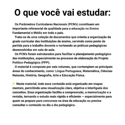 👉 Todo o conteúdo é apresentado em mapas mentais, proporcionando uma visão clara da estrutura das DCN’s, facilitando a associação entre conceitos, a revisão rápida e o estudo estratégico para provas de concursos.