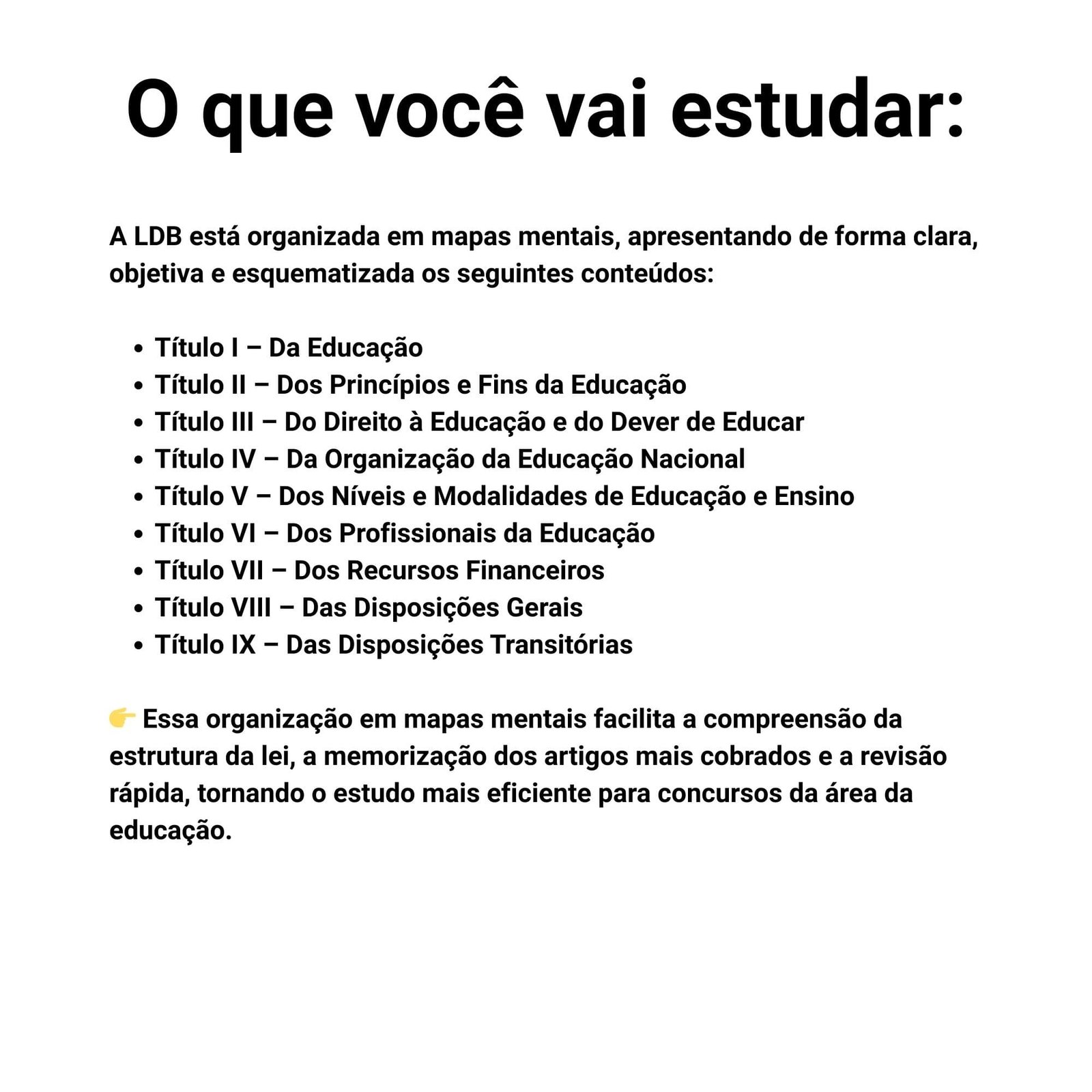 👉 Essa organização em mapas mentais facilita a compreensão da estrutura da lei, a memorização dos artigos mais cobrados e a revisão rápida, tornando o estudo mais eficiente para concursos da área da educação.
