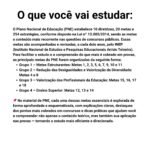 📌 No material de PNE, cada uma dessas metas essenciais é explorada de forma aprofundada e esquematizada, com explicações claras, destaques dos pontos mais cobrados em concursos e dicas práticas que ajudam você a compreender não apenas o conteúdo teórico, mas também sua aplicação nas provas — tornando o estudo mais eficiente e direcionado.